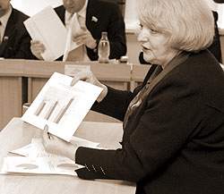Докладчиком по вопросу значилась начальник финансового управления администрации города Луиза Березняк. Луиза Васильевна отлично понимала, что депутаты бюджет не примут. К тому же, все, что она собиралась рассказать о бюджете, депутаты уже не раз от нее же самой слышали. Было видно, что в этой ситуации она чувствует себя не слишком комфортно. И, тем не менее, она мужественно сделала свой доклад.