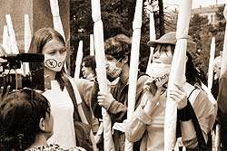 Большинство шло к телецентру молча, свернув плакаты и одев на рот повязку «Откл.». Это символизировало то, что власть затыкает прессе рот. «Нас таким образом отключают от эфира», - говорили участники акции. Люди были всех возрастов – от молодежи до пенсионеров. И все говорили одно и то же. Ложь на государственных телеканалах льется рекой, а независимых СМИ становится все меньше, отмечает корреспондент «Эха Москвы».