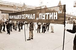 Пока шел митинг, молодежное объединение «Да!» устроило театральное шоу. Ребята построили «вертикаль власти» из коробок, на которых были наклеены фотографии с символикой Первого канала и Российского телевидения. А потом все это разрушили.