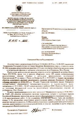 Наконец, в пятницу 21 октября на имя нового председателя областного комитета по культуре Виктора Остренко пришел документ за подписью начальника управления Росохранкультуры по СЗФО Виталия Калинина. Г-н Калинин проинформировал г-на Остренко о том, а) что надзорному органу известно о ходе раскопок на Некрасова, 38 и находках, там обнаруженных, б) что в адрес Росохранкультуры поступило письмо из псковского музея-заповедника (от 19 октября), проинформировавшее надзорный орган о планах застройщика положить над культурном слоем бетонную плиту.