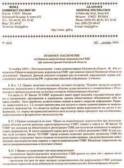 14 ноября 2005 года постановлением главы администрации Псковской области Михаила Кузнецова были утверждены Правила аккредитации журналистов СМИ при администрации Псковской области. По мнению редакции «Псковской губернии», этот документ не вполне соответствует Закону РФ «О средствах массовой информации» - в части соблюдения прав журналистов. Мы обратились в Российский Фонд защиты гласности с просьбой дать правовое заключение.