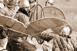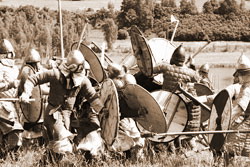После разогрева публики и участников – одиночных упражнений с копьем и мечами – началось главное. Сначала – парный бой ирландца и пикта (двух кельтов). Потом – первое реально острое ощущение – боевое упражнение «черепаха» с метанием копий в сложенные «блоком» щиты, и копья втыкались в эти щиты, и застревали в них, и медленно падали на траву, и публика ахала в одно дыхание. И все были живы.