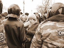 Несмотря на беспрецедентную для Петербурга и тем более для Дворцовой площади (весь минувший ХХ век такого не помнит, разве что 9 января 1905 года еще не удалось перещеголять) ситуацию: с самого начала нагнанные из городов и весей Северо-Запада вместе с собственными доморощенными ОМОНовцами методично исполняли явно намеренно поставленную перед ними задачу: просто хватать, задерживать, бить, заламывать руки, тащить по асфальту. Задача была поставлена глубоко частная и локальная – потому что даже написанием рапортов бойцы не были озабочены. Они просто сгружали людей в отделы милиции, а там уж дежурные головы мучились над бумажками. Художник с холстом под мышкой, юный активист из оппозиционной организации, придерживающийся позиции ненасильственного сопротивления, или «отвязанный» протестующий по зову сердца, который ухитрился в момент задержания несколько раз лягнуть огромного стража порядка – в большинстве своем в протоколах они получили как под копирку написанное: «Выражался нецензурными словами, нарушал общественный порядок». Примерно 30 процентов от всех, посетивших в это время Дворцовую и еще около сотни задержанных на подходах или после (всего в автозаки было затолкано свыше 400 человек) оказались страшными матерщинниками. И, похоже, самой главной бранью с точки зрения блюстителей порядка было: «Это наш город!» и «Конституция!» - ибо именно при скандировании этих слов стражи суверенной демократии обнаруживали явное озверение и цепями неслись на петербуржцев.