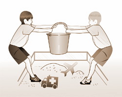 В принципе, такая ситуация дома меня не сильно беспокоит. Ребенок с детства знал, что есть мамины, папины и Сашины вещи, которые трогать категорически запрещается. Должен же он был, в конце концов, догадаться, что его игрушки – такая же частная собственность. Саша – взрослый мальчик и способен реагировать адекватно. «Ну, Лёва, не хочешь делиться – играй один». Все по-честному. Лев имеет полное право единолично владеть игрушками, Саша – не играть с жадиной. Рано или поздно в маленькой голове возникнет мысль, что делиться выгоднее, чем чахнуть над «златом» в углу и одиночестве.