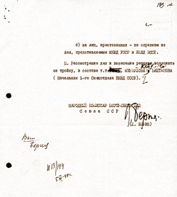 Основой для решения Политбюро стала записка наркома внутренних дел СССР Берии в ЦК ВКП(б) Сталину, датированная также 5 марта 1940 года, которой расстрел перечисленных категорий польских пленных и заключенных предлагался «исходя из того, что все они являются закоренелыми, неисправимыми врагами советской власти». При этом в качестве решения в протоколе заседания Политбюро была дословно воспроизведена заключительная часть записки Берии.