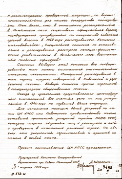 3 марта 1959 года председатель КГБ при Совете Министров СССР А. Н. Шелепин направил первому секретарю ЦК КПСС Н. С. Хрущеву совершенно секретную записку, подтверждавшую, что 14 552 пленных – офицеров, жандармов, полицейских «и т. п. лиц бывшей буржуазной Польши», а также 7305 заключенных тюрем Западной Украины и Западной Белоруссии были расстреляны в 1940 году на основании решения Политбюро ЦК ВКП(б) от 5 марта 1940 года (в том числе 4421 человек – в Катынском лесу). В записке предлагалось уничтожить все учетные дела на расстрелянных.