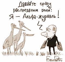 Когда шагающий экскаватор, в смысле – херувим, приземлился, то последовал путинский комментарий: «Должен сказать по-честному: в том, что не все журавли полетели сразу, в этом вина лидера, пилота, потому что он слишком быстро набирал скорость и высоту, и они просто не успевали, и это не вся правда, не вся ситуация… Есть, конечно, птички, которые в стае вообще не летают, они предпочитают вить гнезда где-то отдельно».